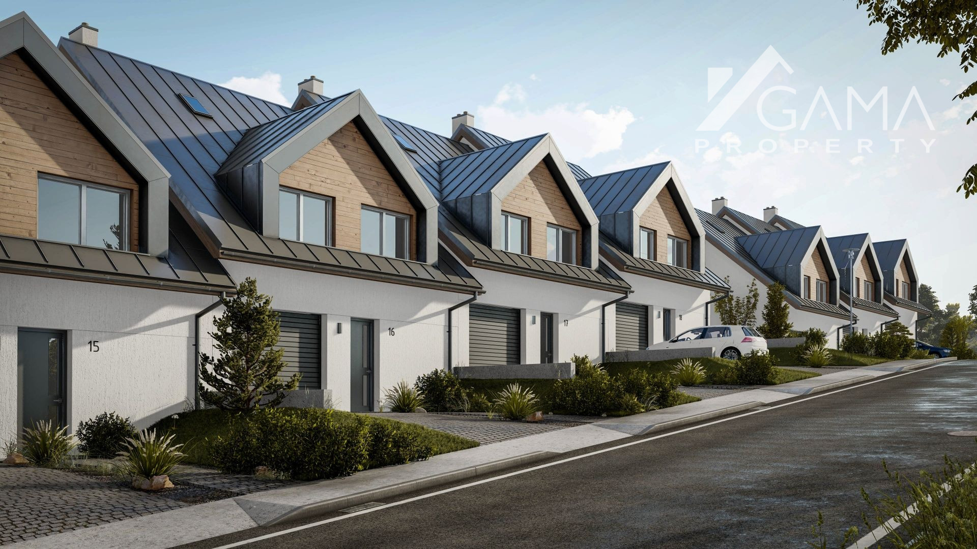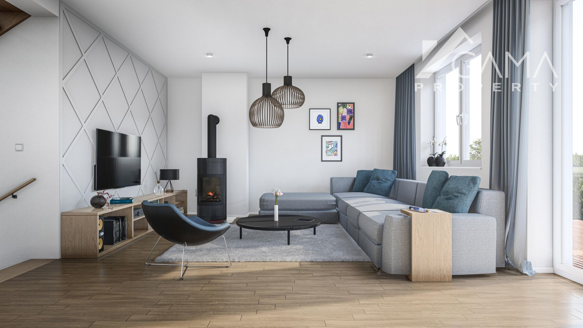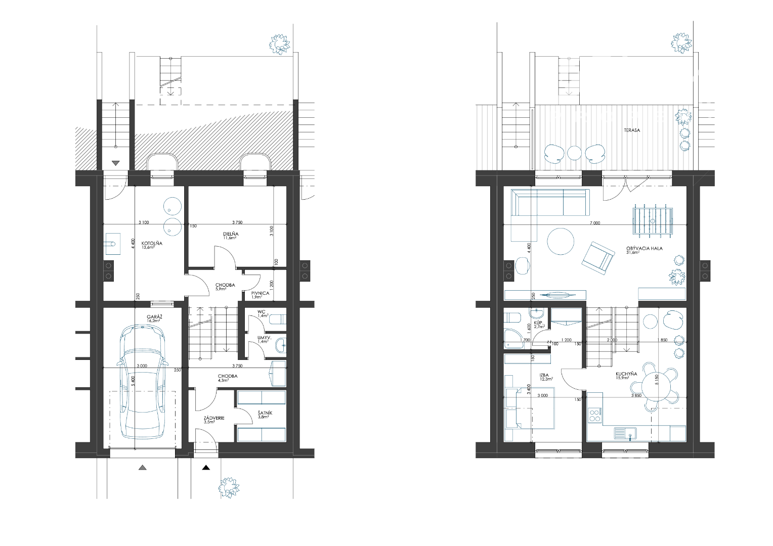 Projekt rodinných domov bol vkusne riešený vzhľadom na danú lokalitu. Na prízemí sa nachádza garáž s dielňou, technickou miestnosťou a toaletou. Z tohto podlažia sa vieme dostať priamo do obývacej izby ktorá má krásny priamy východ do záhrady. Obývacia izba je medziposchodím prepojená s kuchyňou s jedálňou a veľkou spálňou s vlastnou kúpeľnou a WC. Na najvyššom podlaží a nachádzajú 2 samostatné izby s balkónom, ktoré majú spoločnú kúpeľňu s WC. Dom máúžitkovú plochu 150m².